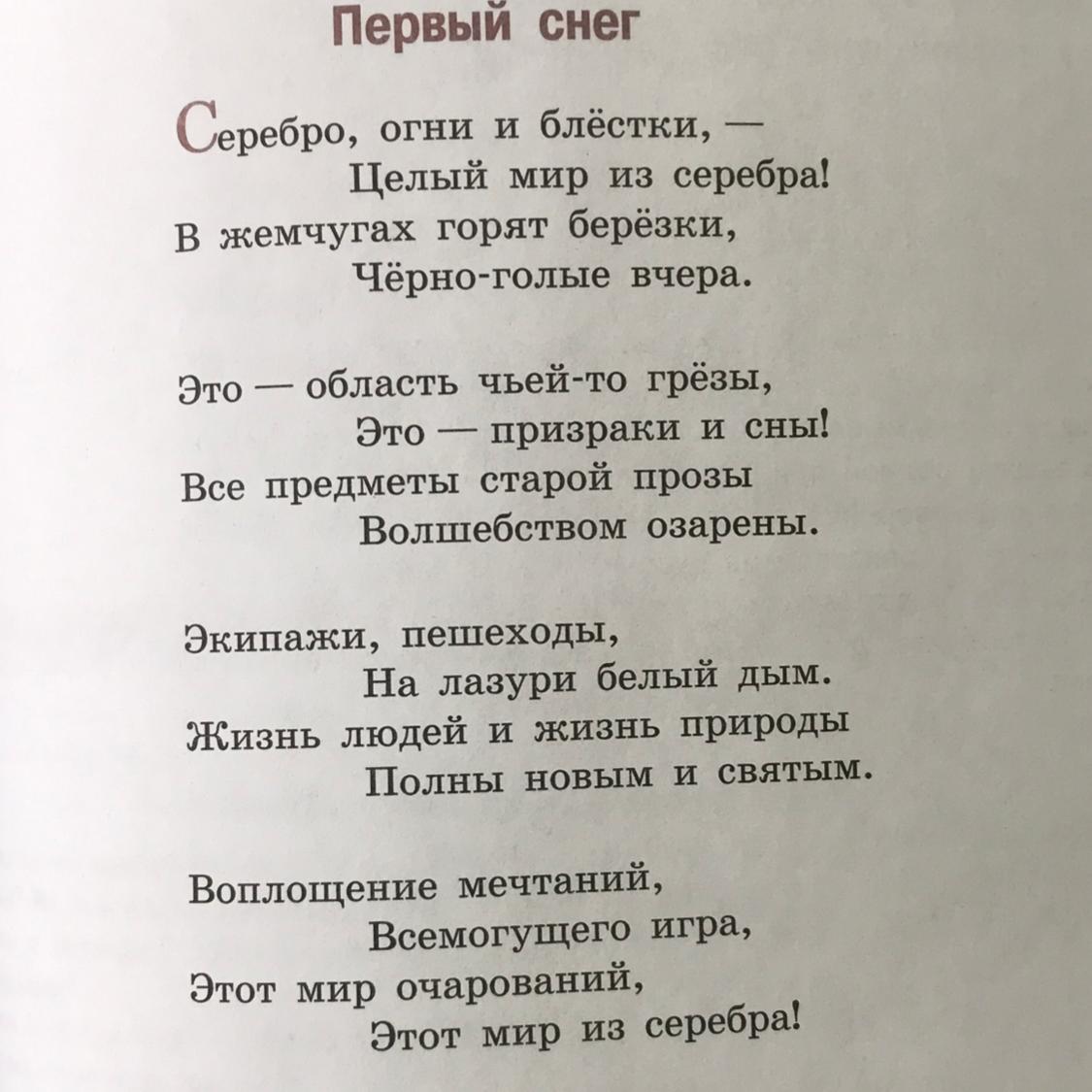 В стихотворении «Первый снег» В. Я. Брюсов описывает начало зимы и появление первого снега, когда весь мир преображается, а человек ощущает себя участником белой сказки. По-разному изображали писатели и поэты первый снег: либо натуралистически конкретно, либо с необычными поэтическими ассоциациями.