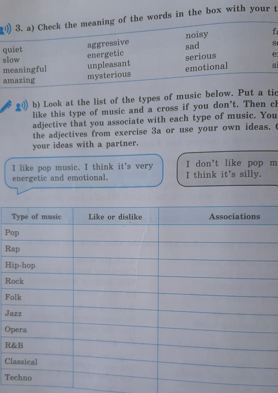 тебе нужно просто отметить вид музыки, которая тебе нравится или не нравится, и написать ассоциации с этим видом музыки.