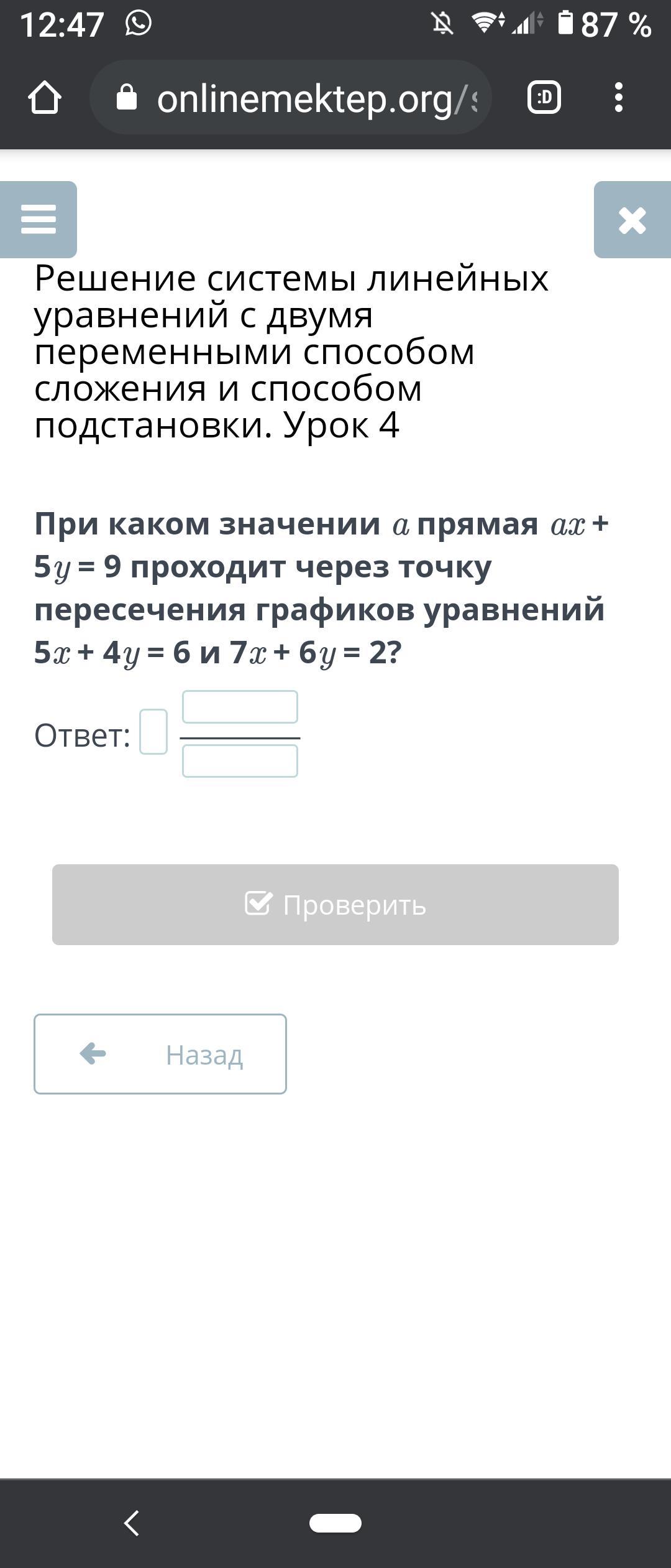 при каком значении а прямая ах+5у=9 проходит через точку пересечения графиков уравнений 5x + 4y = 6 и 7x + 6y = 2?