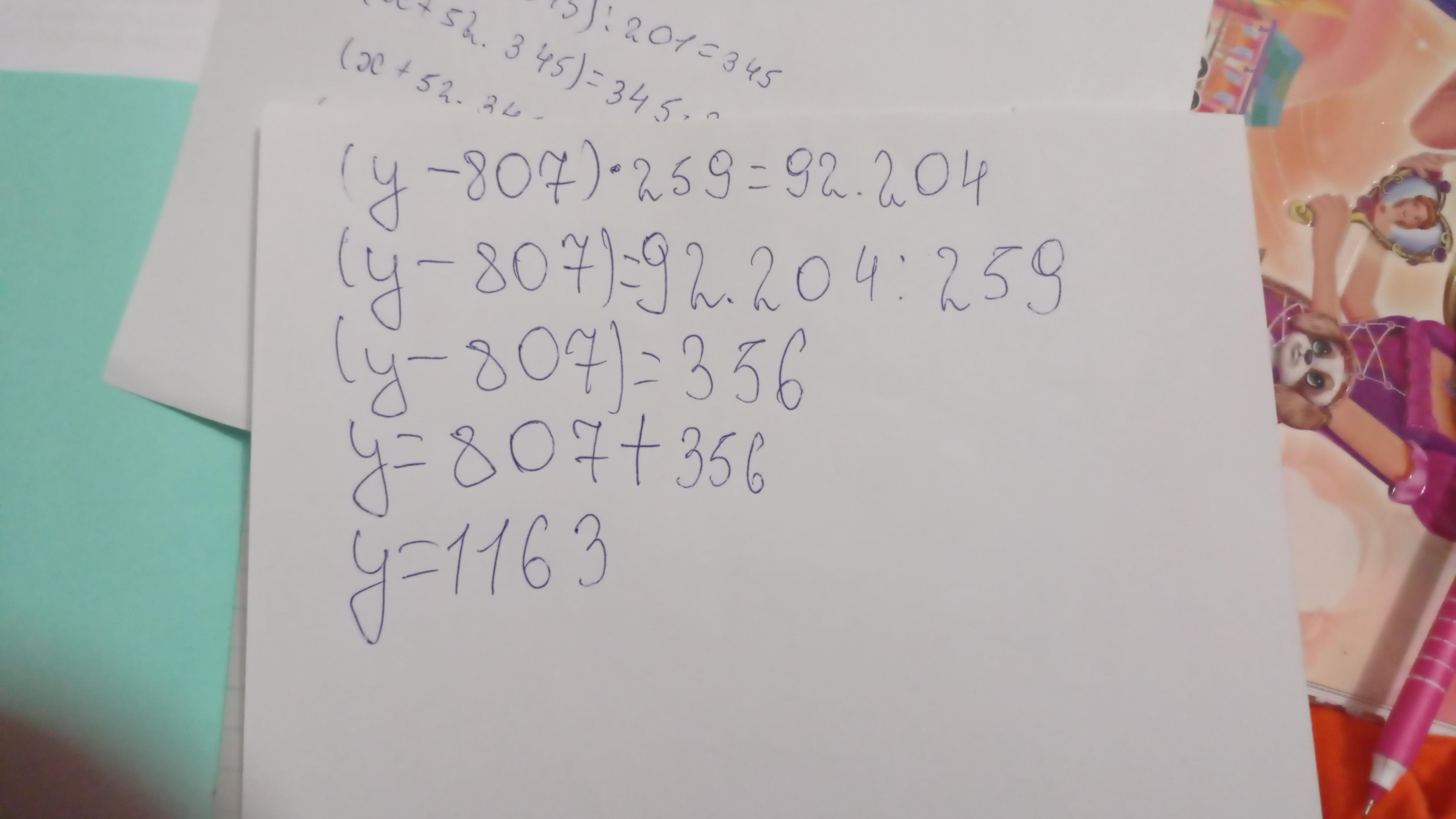 Реши уравнение (х+52.345):201=345,(у-807)*259=92.204помогите плиз