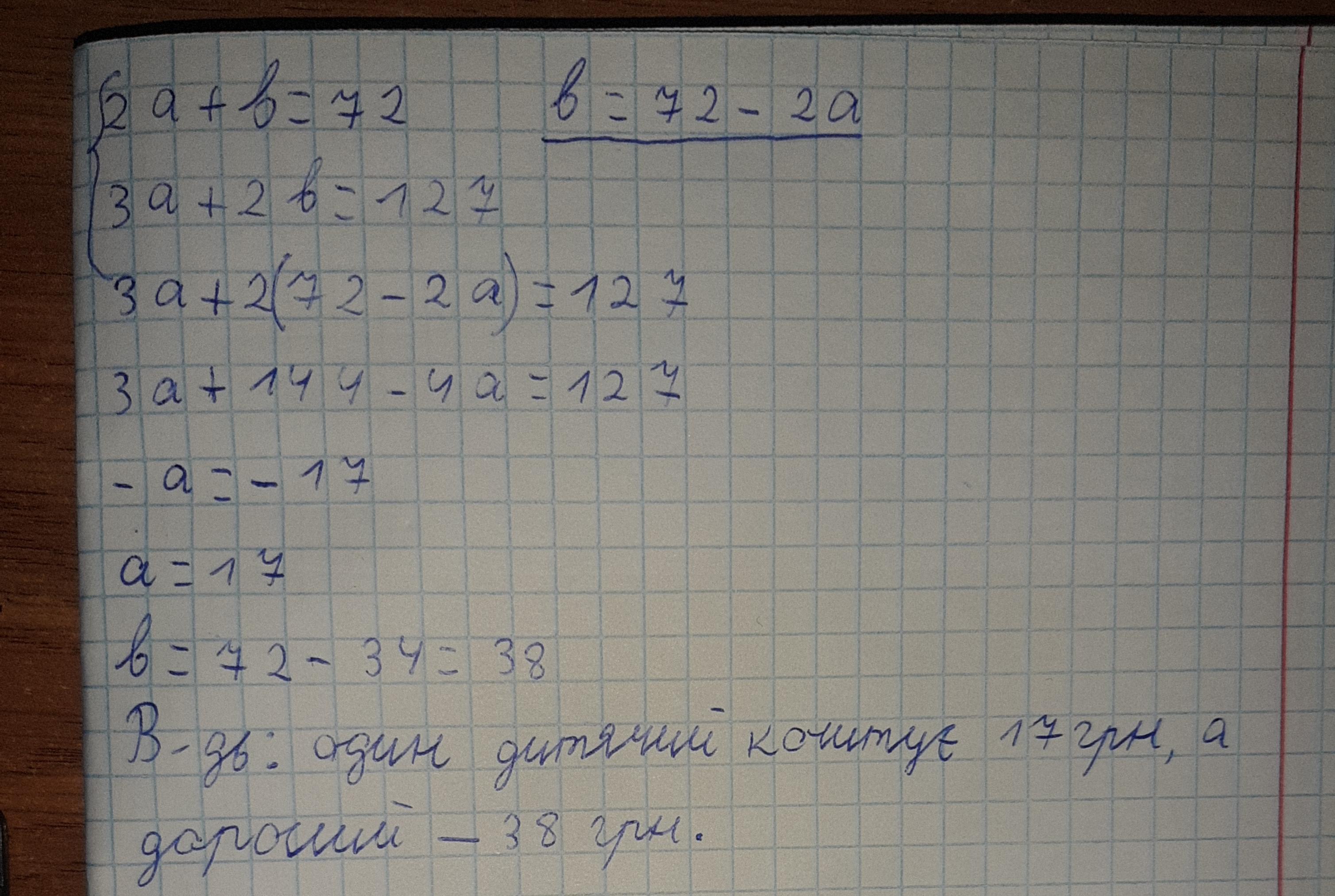 Дві сім'ї вирушили на дитяче свято. Перша сім'я купила два дитячих квитки і один дорослий, і всього заплатила 72 гривень. Друга сім'я купила три дитячих квитки і два дорослих, і всього заплатила 127 гривень. Скільки коштує один дитячий квиток і один дорослий квиток