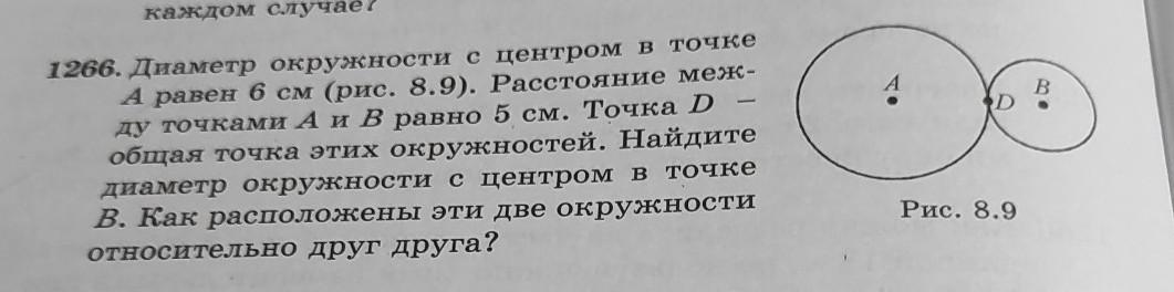 1266 Диаметр окружности с центром в точке А 6 см (рис. 8,9), Расстояние между точками А и В равно 5 см, Точка D