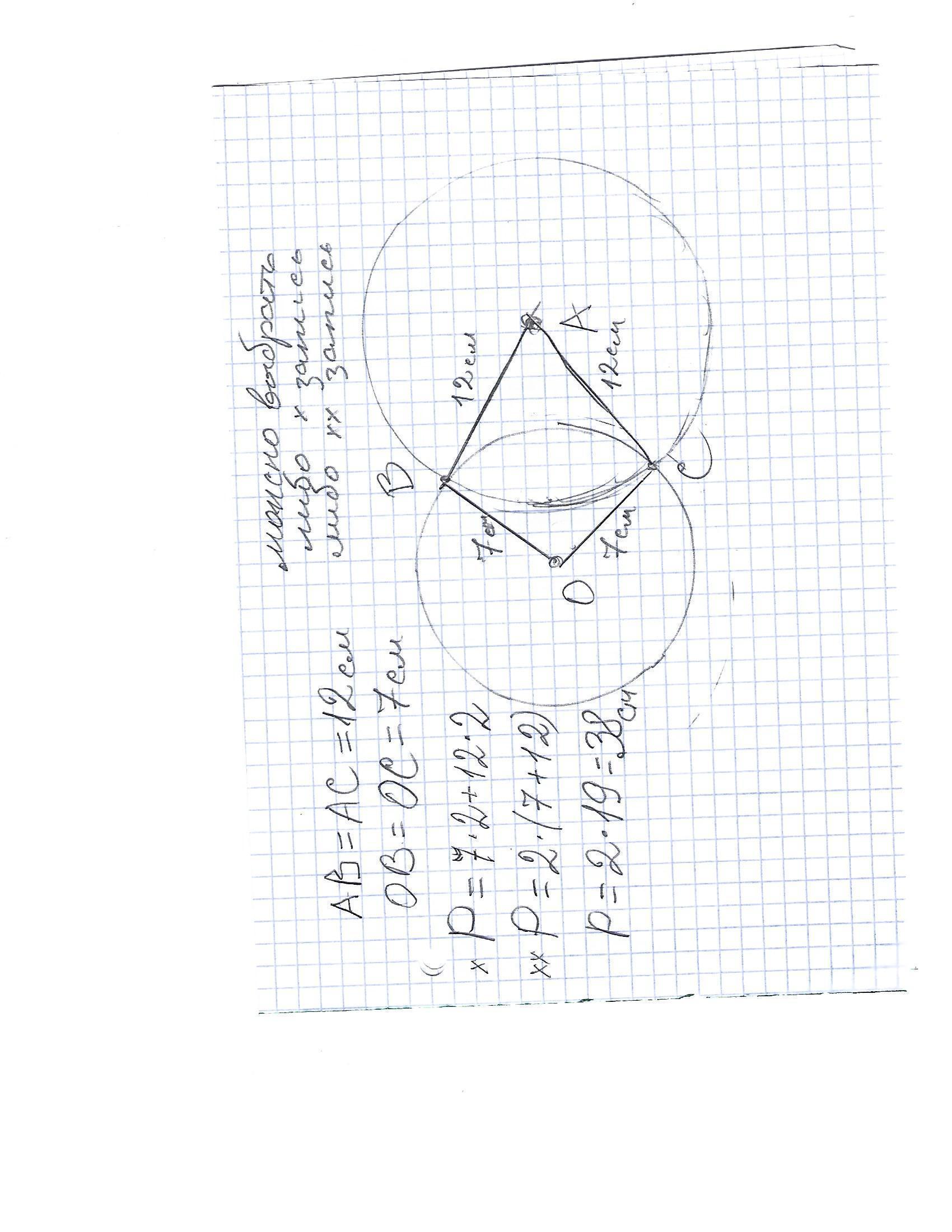 На рисунке изображены две пересекающиеся окружности с центрами в точках A и O. Диаметр окружности с центром в точке A равен 12 см, а диаметр окружности с центром в точке O равен 7 см. Найди периметр четырехугольника ABOC