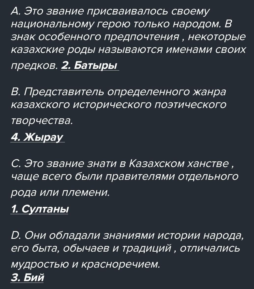 СОР-4. 6кл. История Казахстана. Вопросы: 1.Напишите особенности внешней политики правителей: Касым хана, Есим хана, Хакназар хана. 2.Объяснит е значение понятий: султаны, батыры, бий, жырау. 3.Какова роль Тауке хана во внутренней политике Казахского ханства