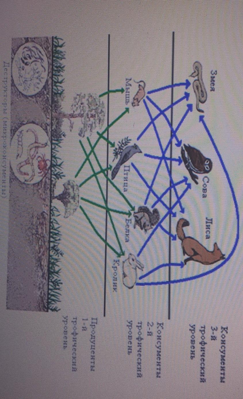 на рисунке представлена пастбищная цепь питания - цепь выедания. продуценты производят энергию и органическое вещество. на каждый новый трофический уровень переходит 1/10 часть всей энергии предыдущего уровня. консументы 1 порядка потребляют непосредственно энергию и вещества, произведенные растениями в процессе фотосинтеза и накопленную в процессе жизнедеятельности. консументы следующих порядков потребляют энергию ниже стоящих уровней. редуценты переводят органическое вещество в почву.