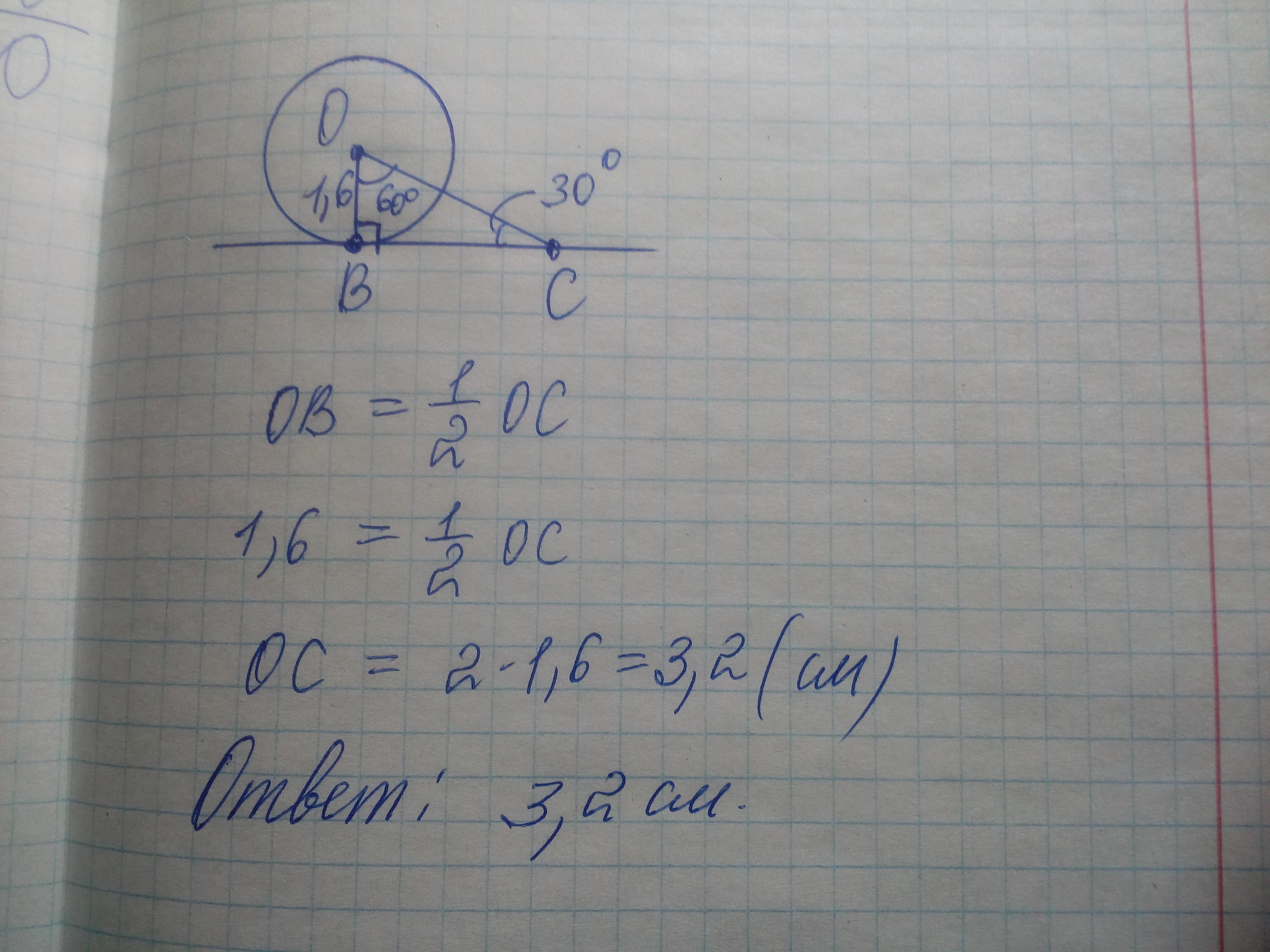 Прямая BC касается окружности с центром О и радиусом ОВ=1,6см в точке В.