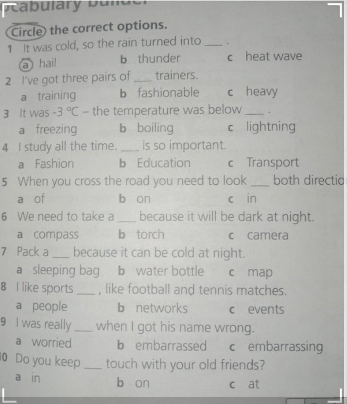 1. hail 2. training 3. freezing 4. Education 5. in 6. torch 7. sleeping bag 8. events 9. embarrassed 10. in