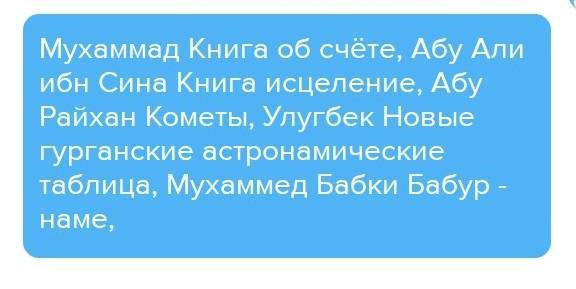 Мухаммад Книга об счёте, Абу Али ибн Сина Книга исцеление, Абу Райхан Кометы, Улугбек Новые гурганские астронамические таблица, Мухаммед Бабки Бабур -наме,
