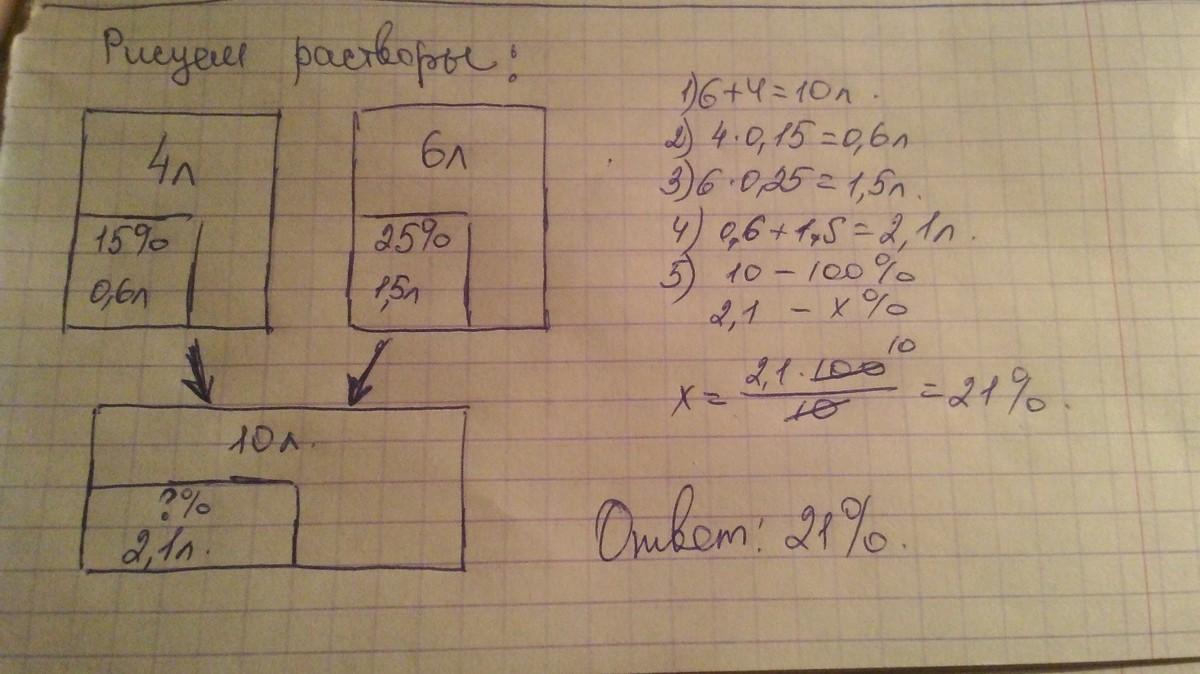 Cмешали 4 литра 15-процентного раствора соли с 6 литрами 25-процентного раствора соли. Сколько процентов составляет концентрация получившегося раствора?