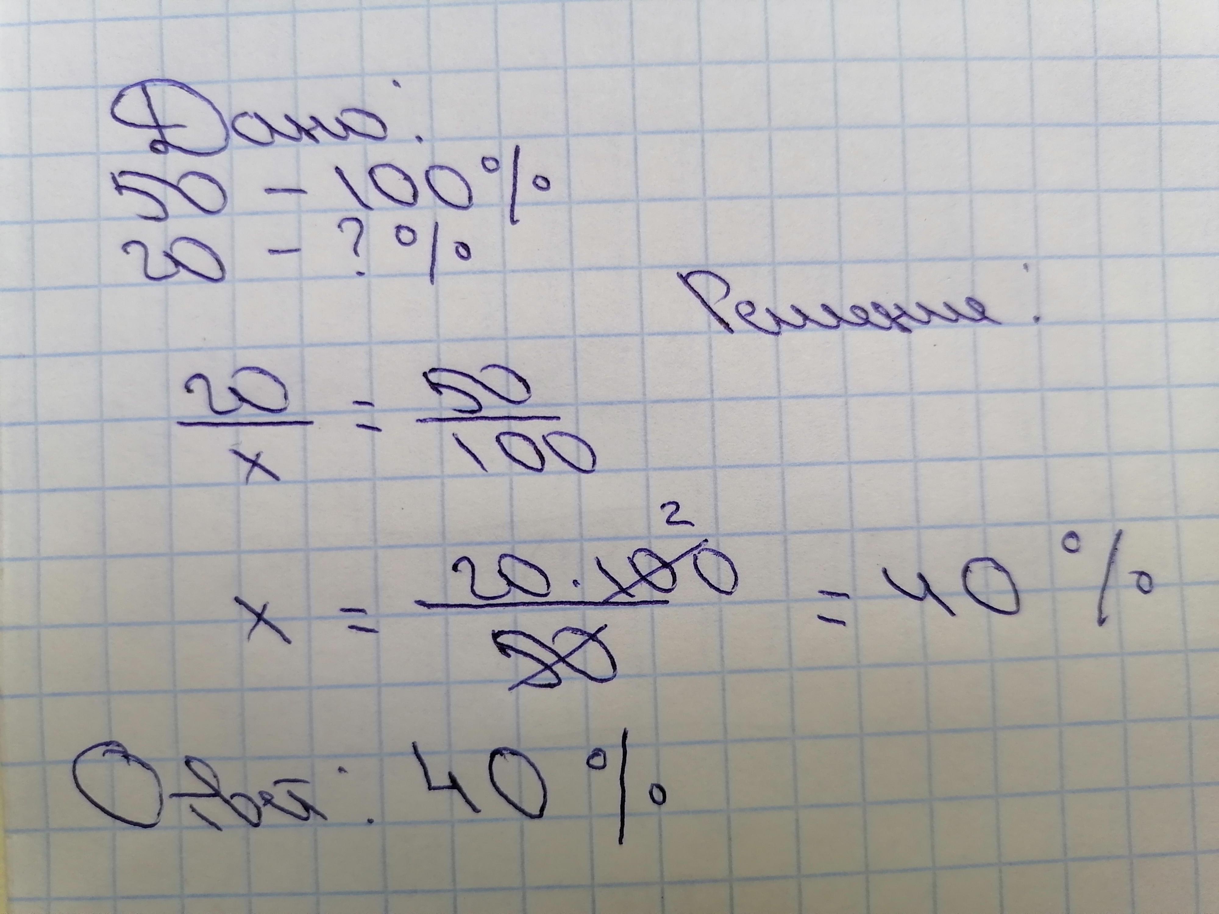 Получается, что 50 я взяла как 100%, а для 20 х%, потому что это неизвестное, которое нужно найти. И дальше составлять пропорцию и решать.