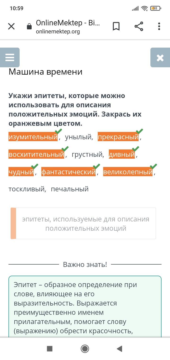 Укажи эпитеты, которые можно использовать для описания положительных эмоций. Закрась их оранжевым цветом.