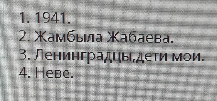 Осенью 1.______ года прозвучало обращение 2.________________________ к защитникам Ленинграда «3.________________________________________». Это стихотворение неоднократно передавалось по радио, его печатали на плакатах, поддерживая дух защитников и жителей города на 4.____________________.