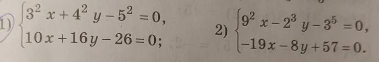 1)3²х+4²у-5²=0; 10х+16у-26=0. Первую систему умножаем на -1 и получаем: -9х-16у+25=0; 10х+16у-26=0. -9х-16у=-25; 10х+16у=26. х=1; 10+16у=26. х=1; у=1