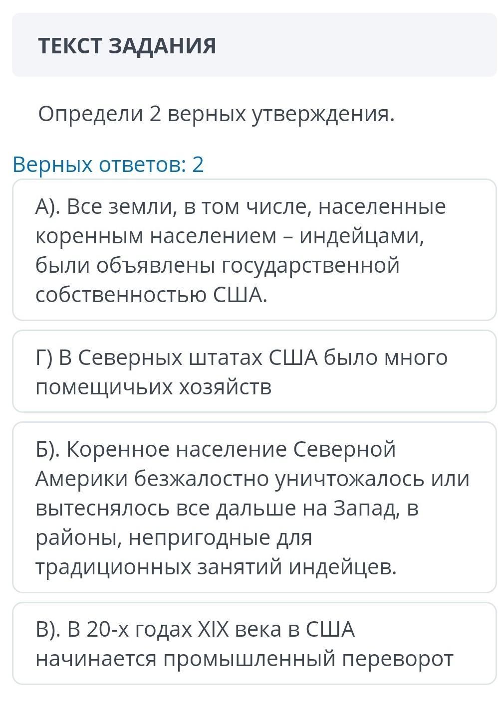 Определи 2 верных утверждения. верных ответов: 2 a). все земли, в том числе, населенные коренным населением - индейцами, были объявлены государственной собственностью сша. г) в северных штатах сша было много помещичьих хозяйств б). коренное население северной америки безжалостно уничтожалось или вытеснялось все дальше на запад, в районы, непригодные для традиционных занятий индейцев. b). в 20-х годах xix века в сша начинается промышленный переворот