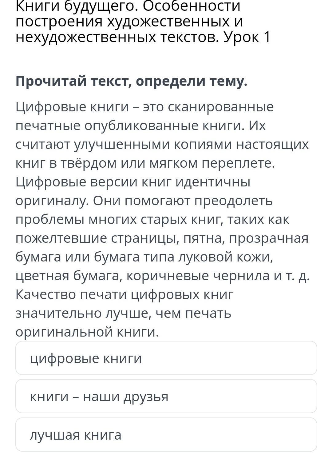 Прочитай текст, определи тему. Цифровые книги – это сканированные печатные опубликованные книги. Их считают улучшенными копиями настоящих книг в твёрдом или мягком переплете. Цифровые версии книг идентичны оригиналу. Они помогают преодолеть проблемы многих старых книг, таких как пожелтевшие страницы, пятна, прозрачная бумага или бумага типа луковой кожи, цветная бумага, коричневые чернила и т. д. Качество печати цифровых книг значительно лучше, чем печать оригинальной книги. цифровые книги книги наши друзья лучшая книга