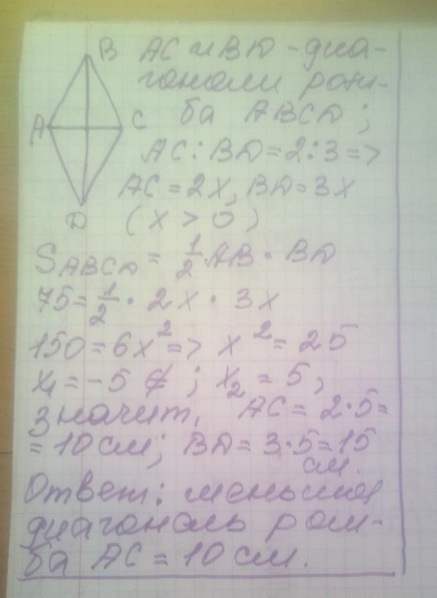 S= d1*d2/2. Пусть коэффициент будет х см, тогда d1= 2x. A d2=3х. 75= 2x*3x/2. 75= 3x^2 . X^2= 75/3 . X^2 = 25. X1 = -5 не удовлетворяет условию. Х2 = 5 см. d1 = 2x= 2* 5 = 10 см меньшая диагональ ромба
