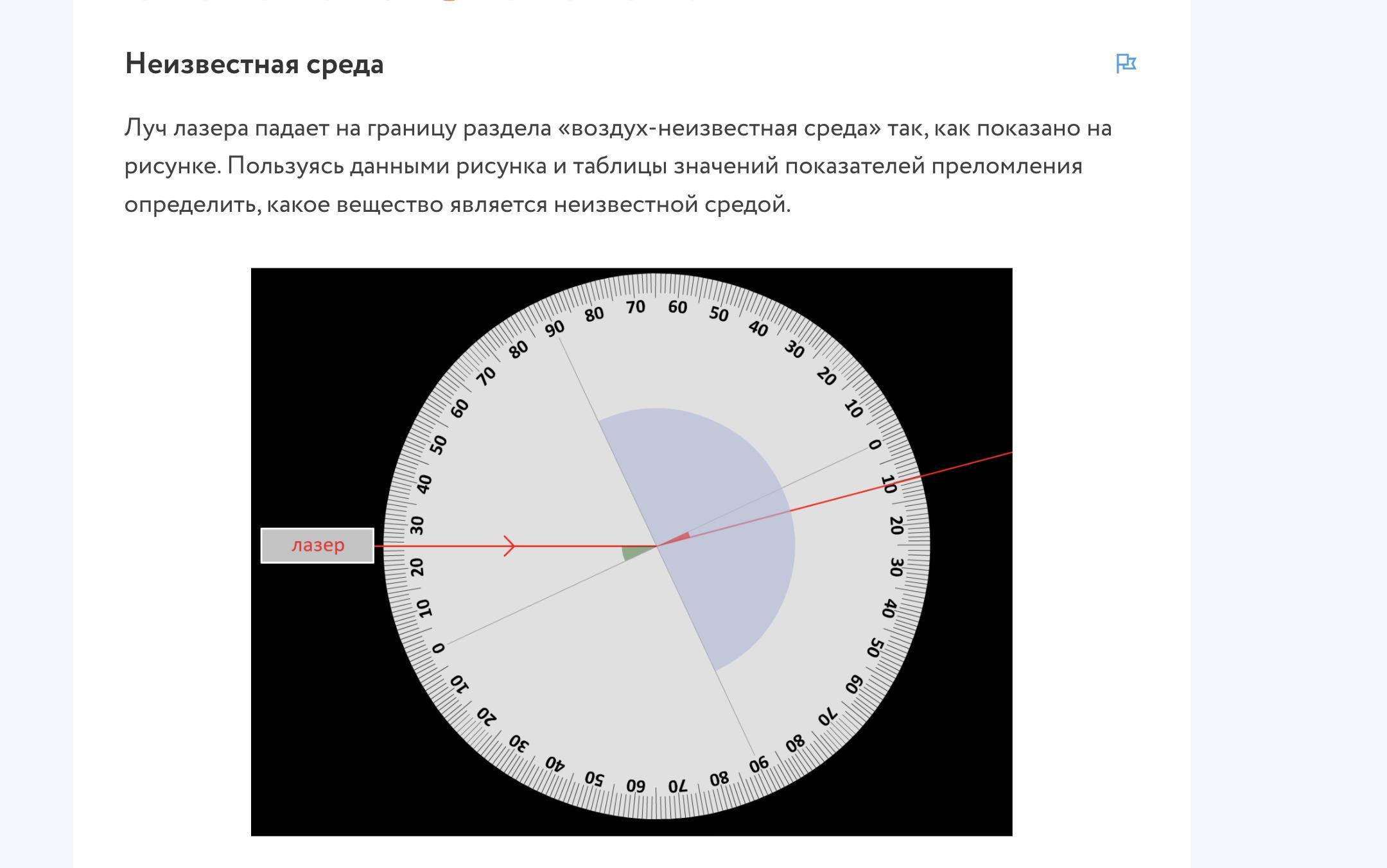 Луч лазера падает на границу раздела «воздух-неизвестная среда» так, как показано на рисунке. Пользуясь данными рисунка и таблицы значений показателей преломления определить, какое вещество является неизвестной средой.