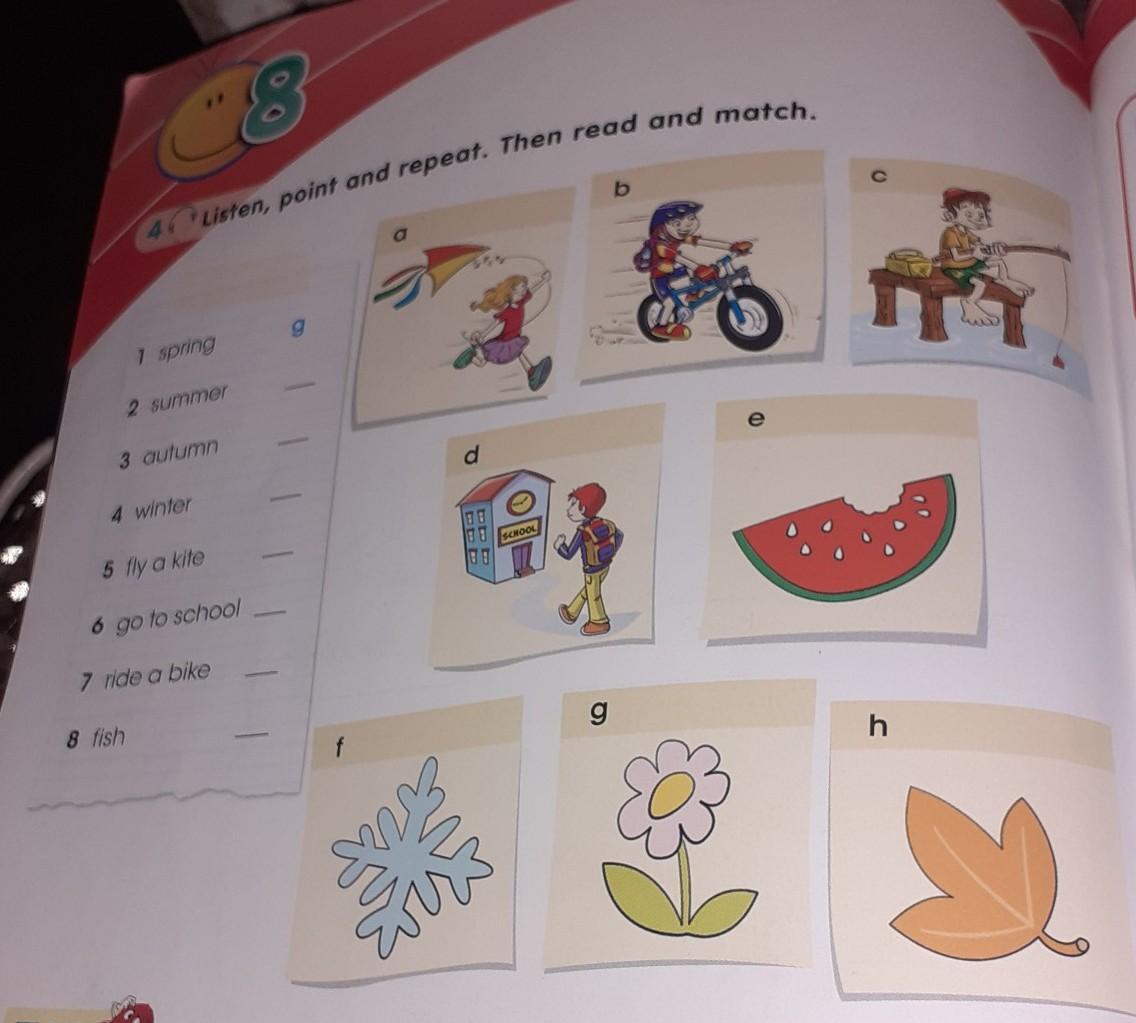 Обяснение: Конечно не про все картинки расскажу, но обясню некоторые. Например саммер(summer) это лето, арбузы растут летом, а арбуз под буквой e. И так далее....