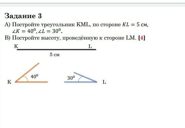 А) Постройте треугольник KML, по стороне KL= 5 см,K=40°,L=30°