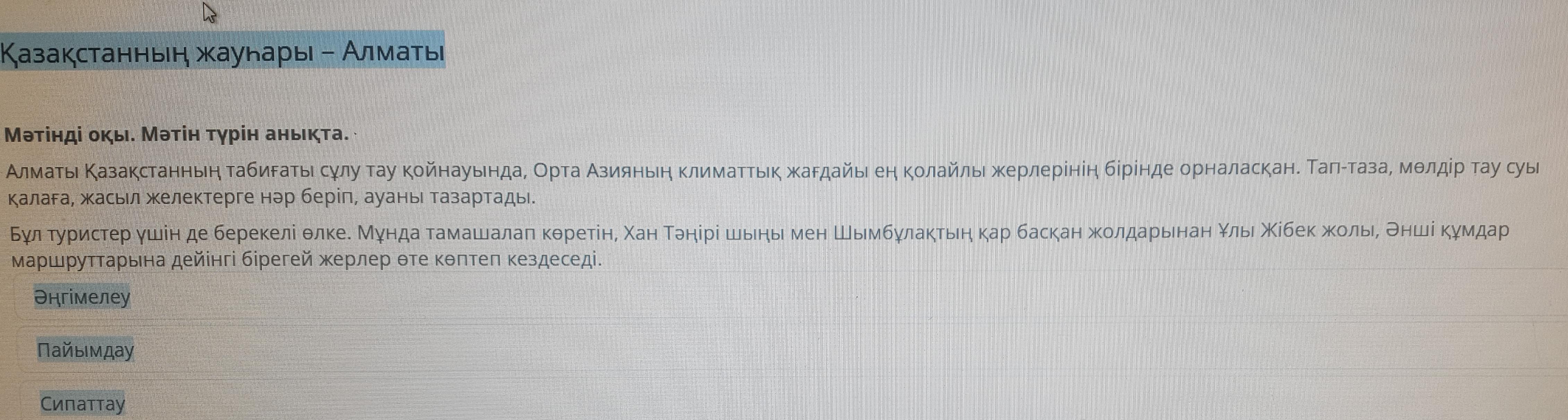 Бұл сипаттау мәтіні. Себебі мәтінде Алматының табиғаты және ондағы ерекше жерлер туралы сипаттап тұр.