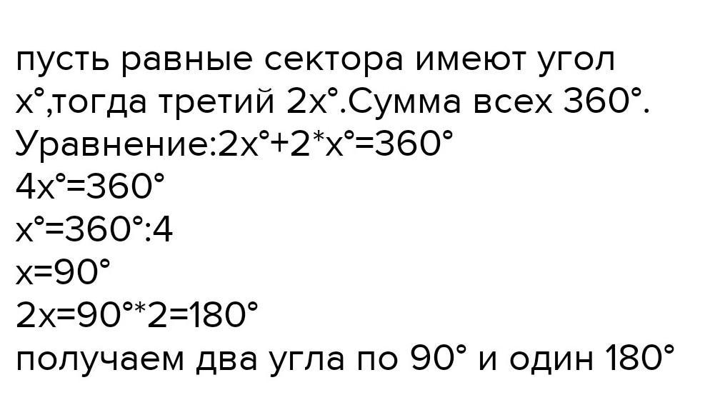 Дөнгелек үш секторға бөлінген.оның екі секторының бұрышы бірдей ал үшінші бұрышы осы бұрыштарыдың әрқайсысынан екі есе артық.осы секторлардың бұрышы неге тең? Қандай бұрыштар шықты?
