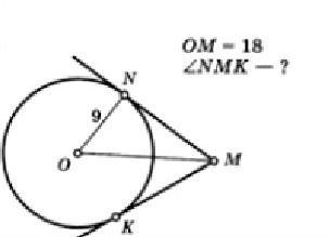 OM = 18, ON = 9. ON - радиус, проведённый к точке касания касательной к окружности, отсюда ∠ONM = 90°. Напротив ∠NMO лежит катет ON, ON = 9, гипотенуза OM = 18, то есть катет ON в два раза меньше гипотенузы OM. Как мы знаем, катет, лежащий напротив угла в 30°, равен половине гипотенузы. Получается, что ∠NMO = 30°. Для ΔOKM аналогичная ситуация (∠OMK = 30°). ∠NMK = ∠NMO + ∠OMK.