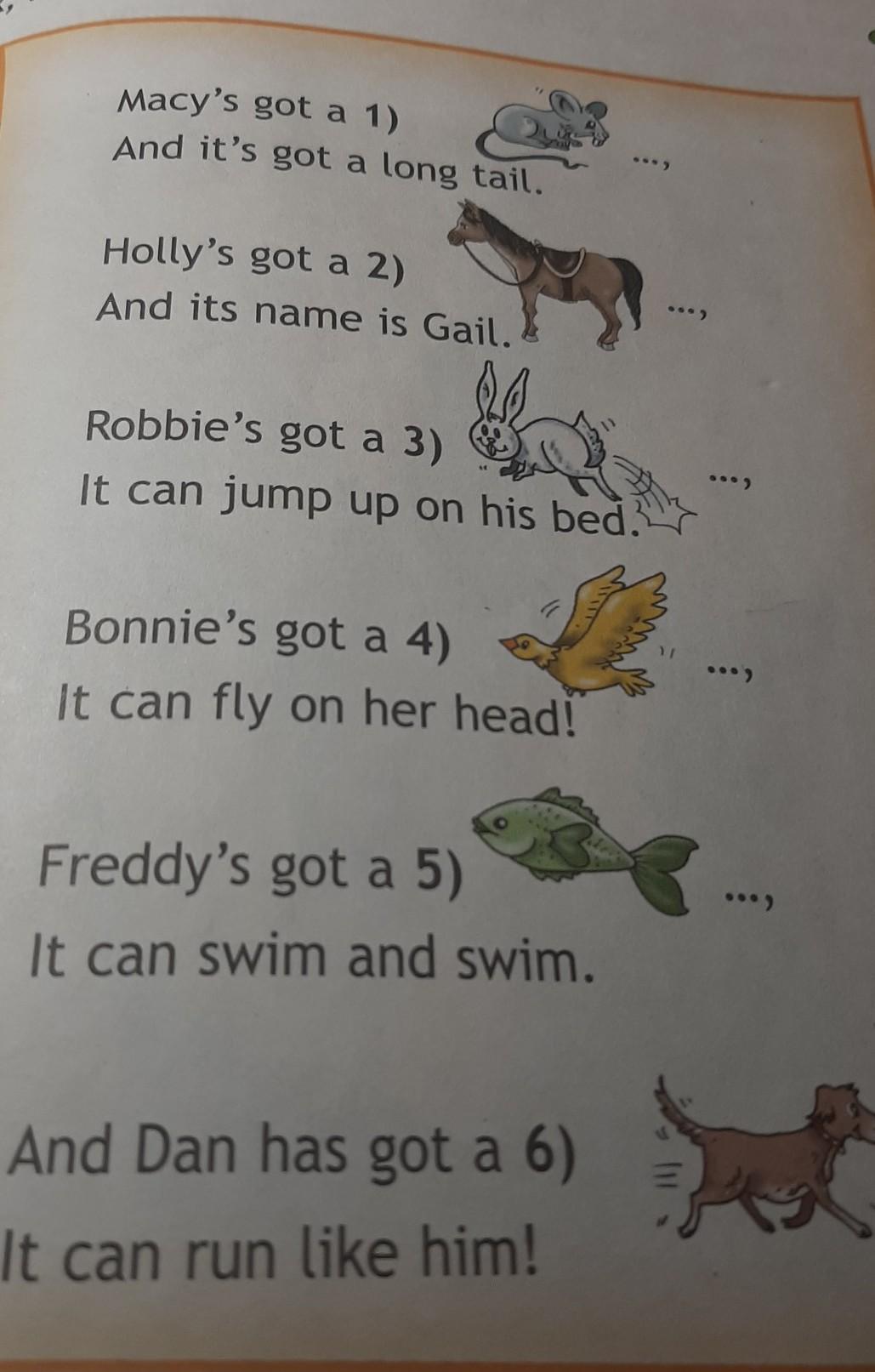 вопросы 1Who's got a mouse? 2What is Gail? 3 What can Robbie's rabbit do? 4 What can Bonnie'sbird do? 5 What can swim? 6 What can Dan and his dog do?