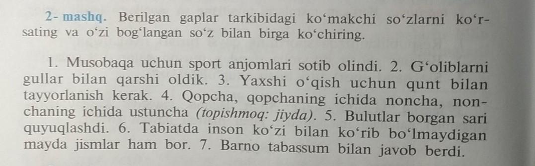 1. Musobaqa uchun. 2. Gullar bilan. 3. Yaxshi o`qish uchun, qunt bilan. 4. Qopchaning ichida, nonchaning ichida. (ichida точно входит или нет не знаю, но НАВЕРНОЕ так) 5. Borgan sari. 6. Ko`zi bilan. 7. Tabassum bilan.