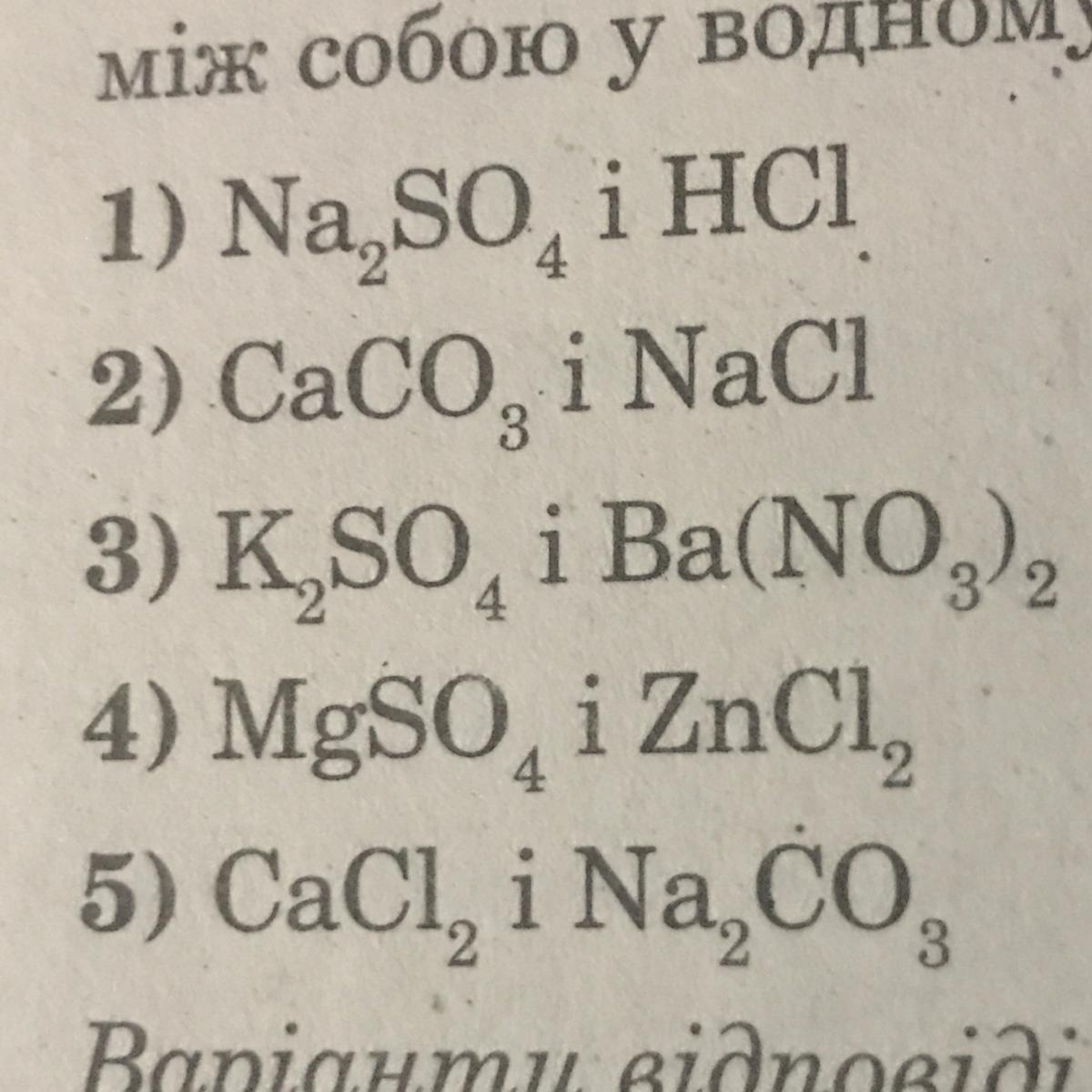 у якому варіанті відповіді вказано речовини,які реагують між собою у водному середовищі