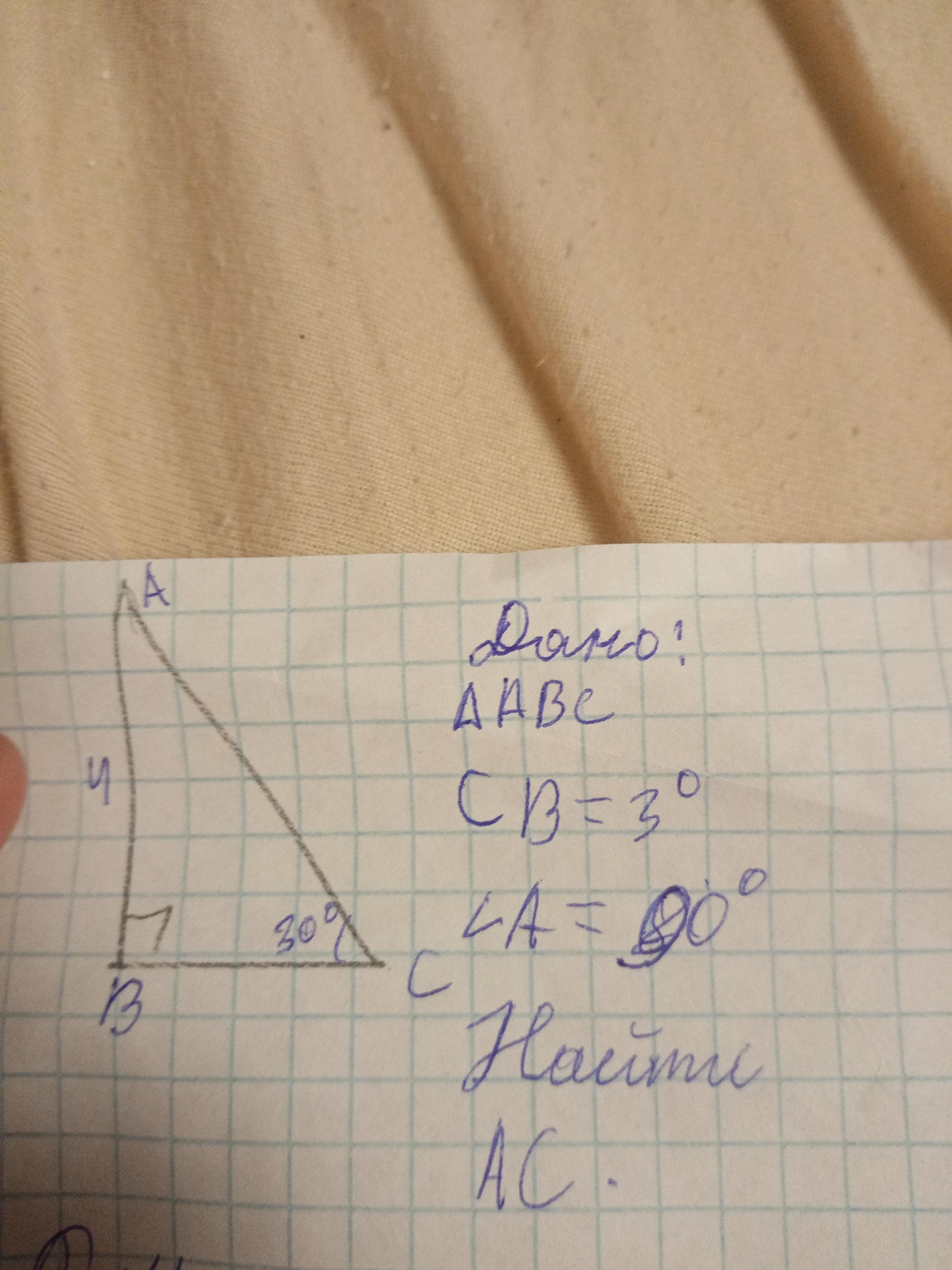есть теорема, которая говорит: что перпендикулярная пряма, лежащая напротив угла 30°, равна половине катета. Тоисть AC = AB • 2 = 4• 2 = 8