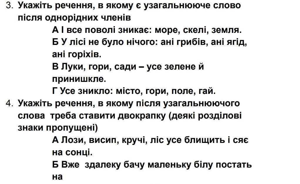 Укажіть речення, в якому після узагальнюючого слова треба ставити двокрапку (деякі розділові знаки пропущені) А Лози, висип, кручі, ліс усе блищить і сяє на сонці. Б Вже здалеку бачу маленьку білу постать на обніжку. В Скрізь червоно на небі, на узгір'ях і на горі. Г Річки, трава, птахи, люди усе навколо сповнене весняної сили.
