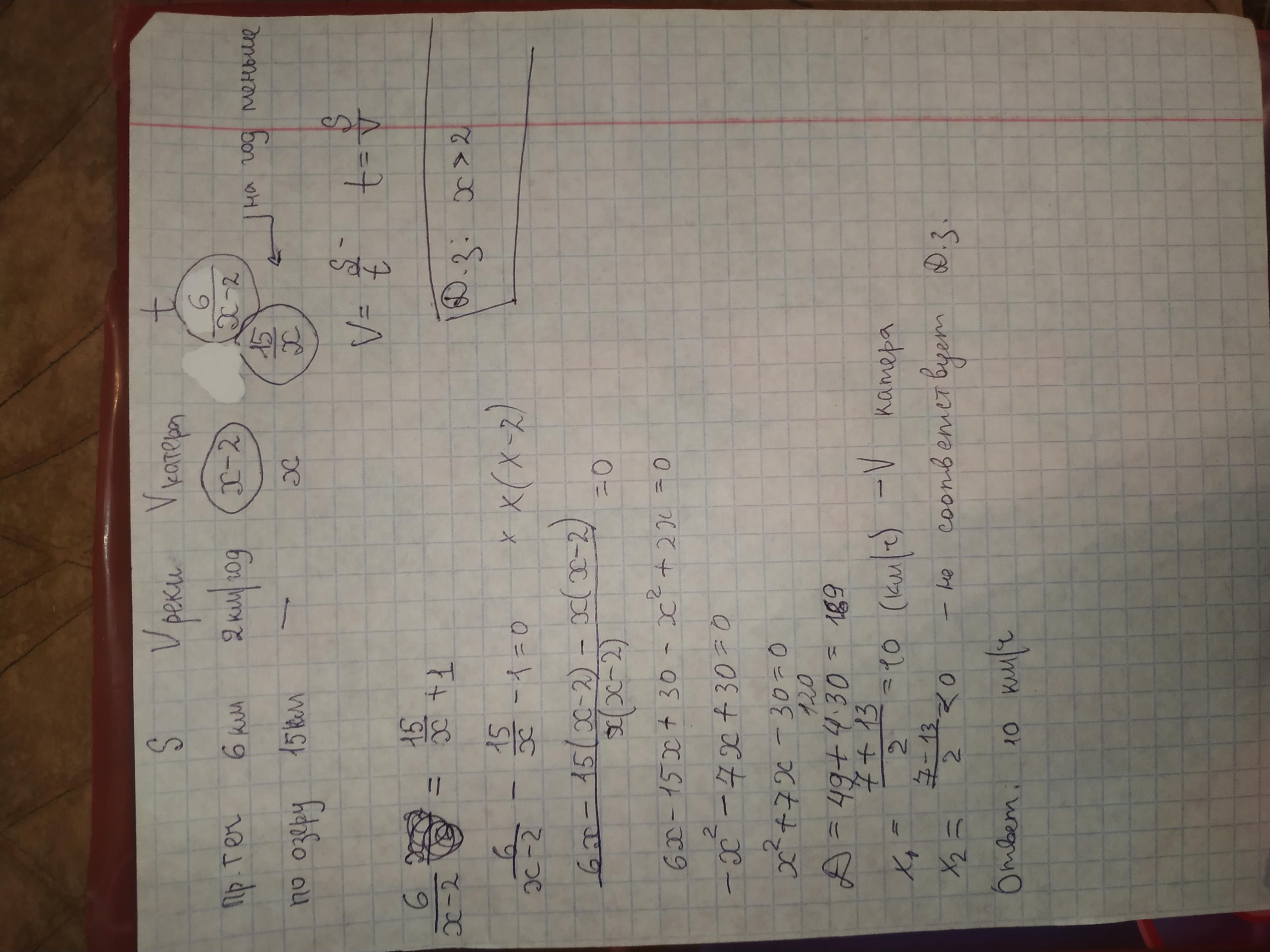 Катер пройшов по озеру 15 кілометрів і потім по річці 6 кілометрів, швидкість якої 2 км / ч. яка власна швидкість катера, якщо по озеру він пройшов на 1 годину швидше, ніж по річці?