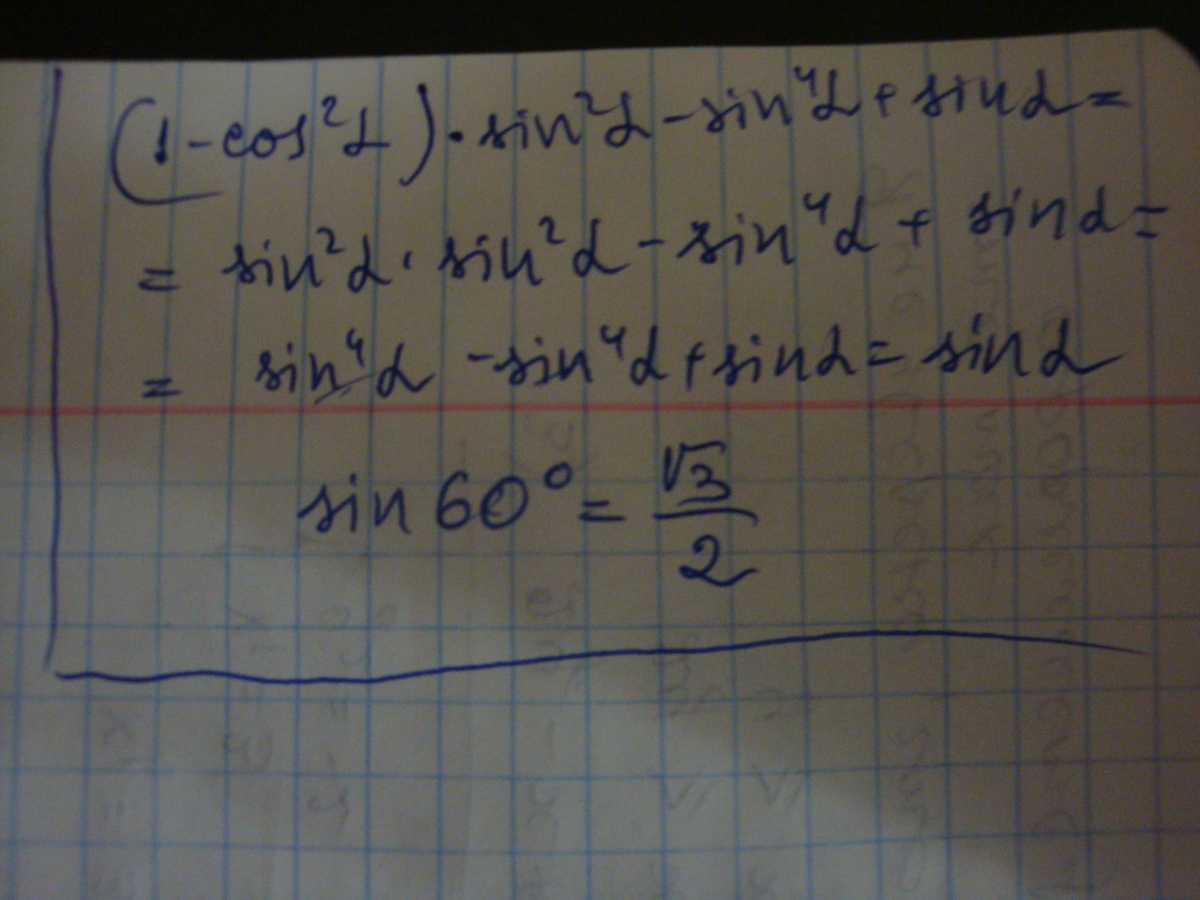 (1-cos^2 (a))*sin^2 (a)-sin^4 (a)+sin(a)=sin^2 (a)*sin^2 (a)-sin^4 (a)+sin (a)=sin^4 (a)-sin^4 (a)+sin (a)=sin (a)