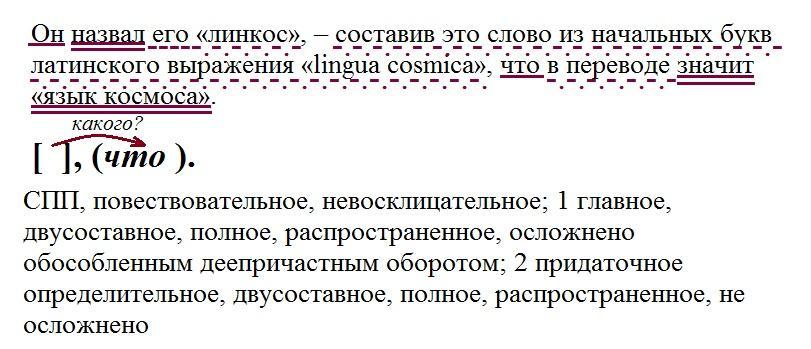 Он назвал его «линкос», – составив это слово из начальных букв латинского выражения «lingua cosmica», что в переводе значит «язык космоса»(синтаксический разбор +схема)пожалуйста, нужна помощь