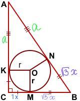второй катет обозначим как (а+х) и гипотенуза получится =а+√3х, т.к. отрезки касательных, проведенных к окружности из одной точки, равны...