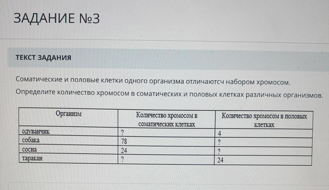 Определите количество хромосом в соматических и половых клетках различных организмов.