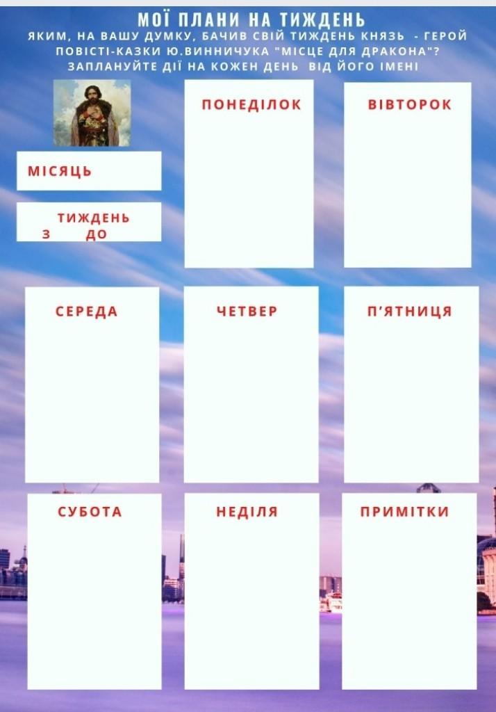 Mої ПЛАНИ НА ТИЖДЕНЬ ЯКим, НА ВАШУ ДУМКУ, БАЧИВ СВІЙ тижДЕНЬ КнязЬ - ГЕРОЙ ПОВICTI-КАЗКИ ю.ВИННИЧУКА "МIСЦЕ ДЛЯ ДРАКкОНА"? ЗАПЛАНУЙТЕ ДIї НА КОЖЕН ДЕНЬ Від ЙОГО IМЕНI