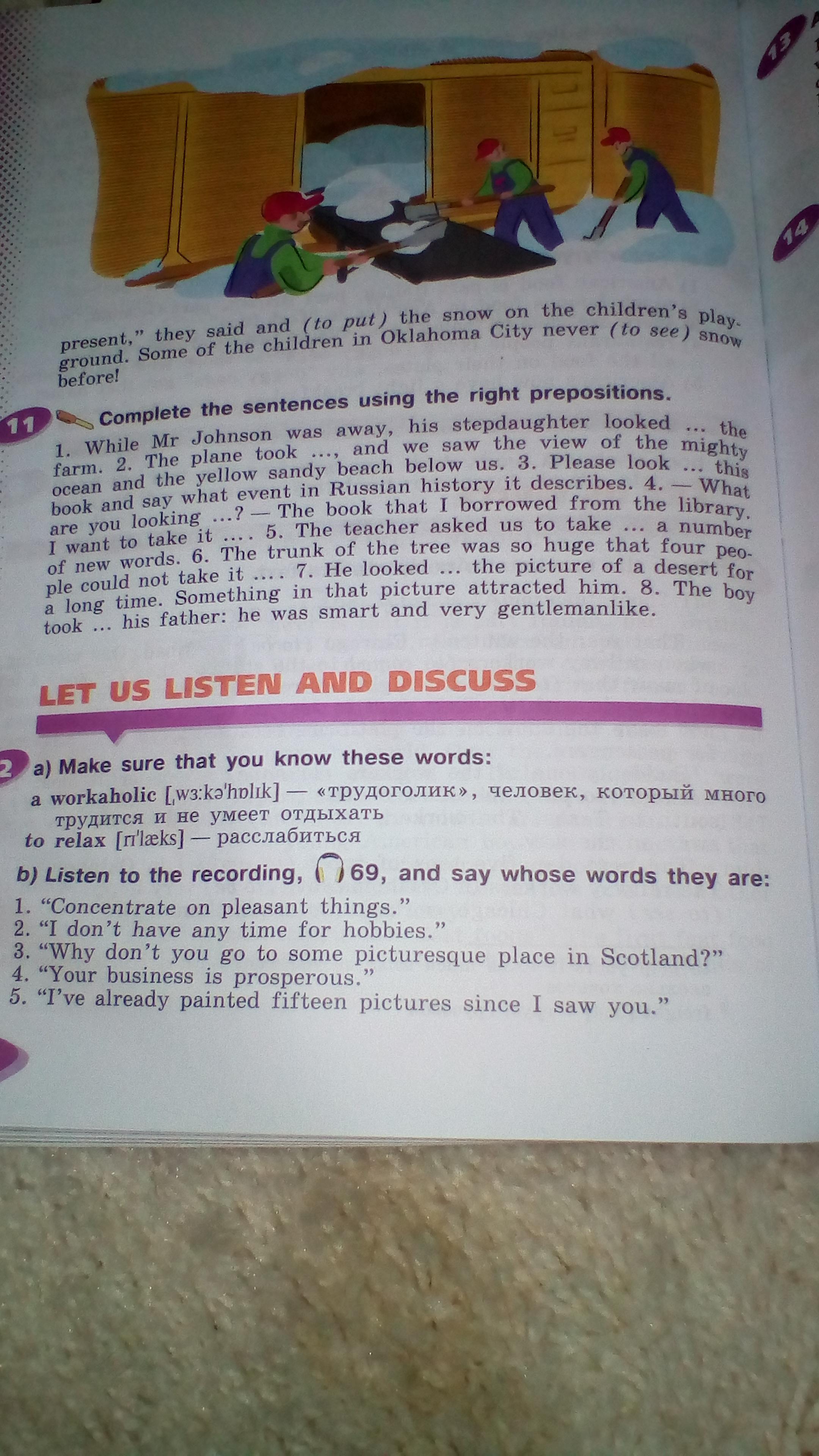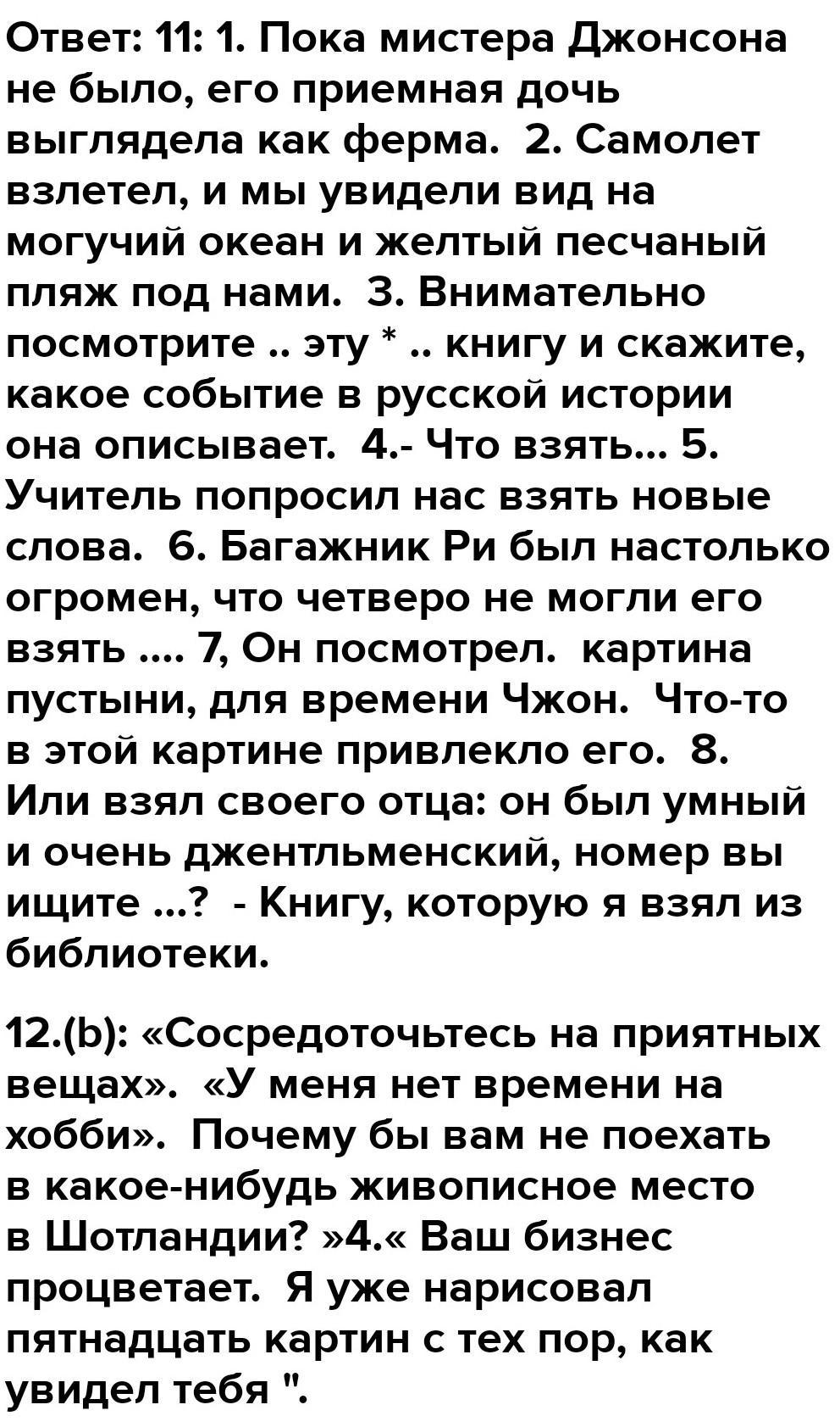 Ответ: 11: 1. Пока мистера Джонсона не было, его приемная дочь выглядела как ферма. 2. Самолет взлетел, и мы увидели вид на могучий океан и желтый песчаный пляж под нами. 3. Внимательно посмотрите .. эту * .. книгу и скажите, какое событие в русской истории она описывает. 4.- Что взять… 5. Учитель попросил нас взять новые слова. 6. Багажник Ри был настолько огромен, что четверо не могли его взять .... 7, Он посмотрел. картина пустыни, для времени Чжон. Что-то в этой картине привлекло его. 8. Или взял своего отца: он был умный и очень джентльменский, номер вы ищите ...? - Книгу, которую я взял из библиотеки.