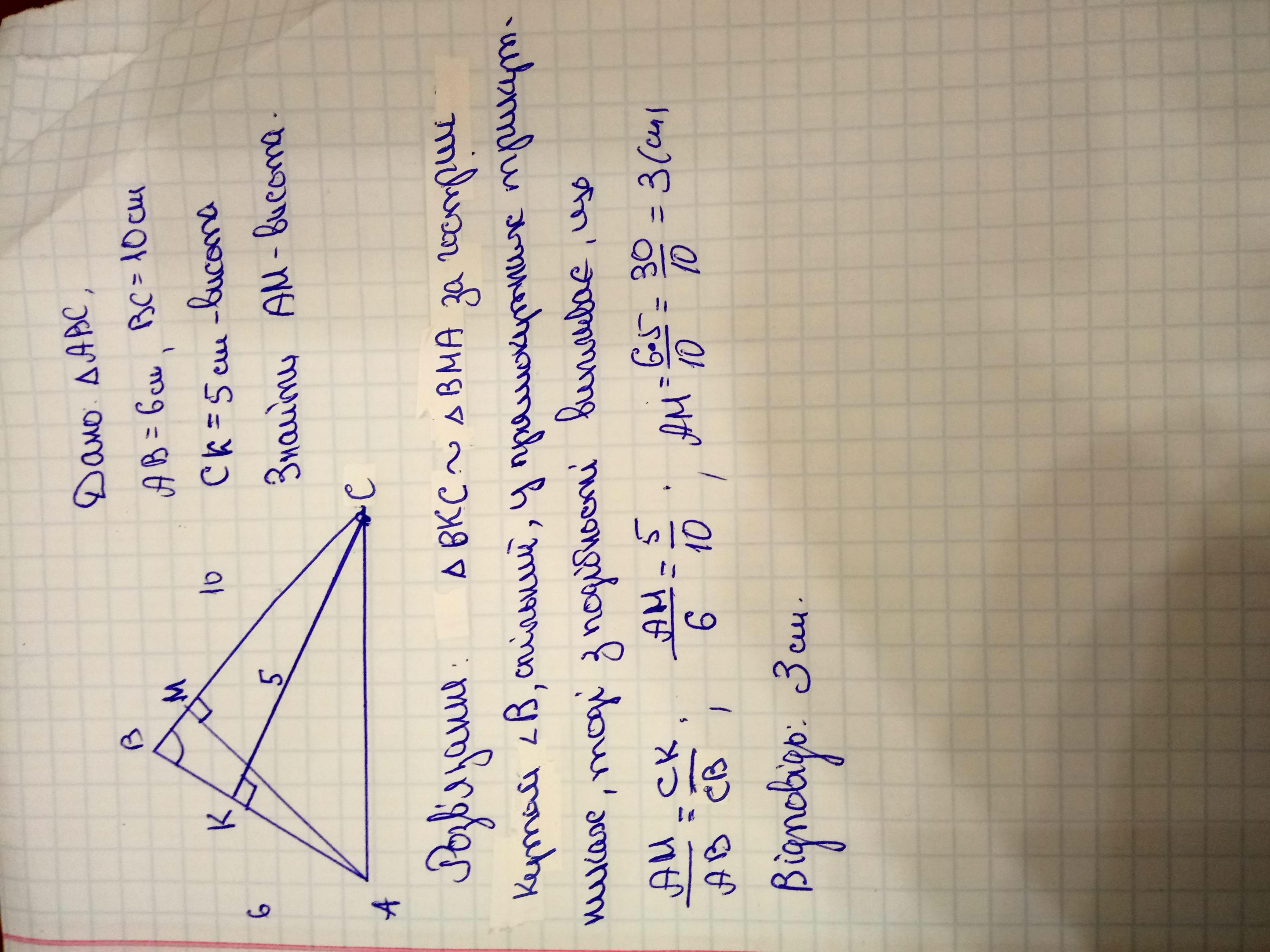 дві сторони трикутника дорівнюють 10 см і 6 см а висота що проведена до меншої з цих сторін -5см знайдіть висоту проведену до більшої з двох даних сторін