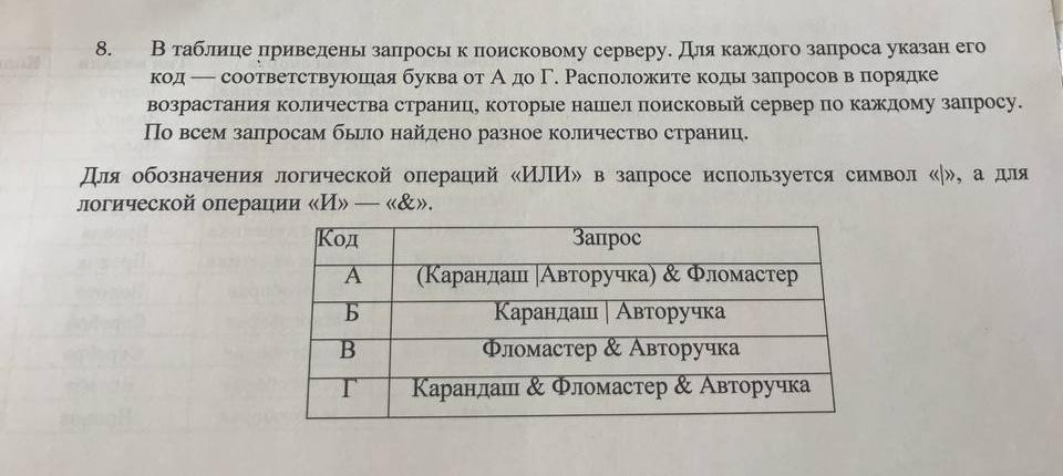 срочно. В таблице приведены запросы к поисковому серверу. Для каждого запроса указан его - код соответствующая буква от А до Г. Расположите коды запросов в порядке возрастания количества страниц, которые нашел поисковый сервер по каждому запросу. По всем запросам было найдено разное количество страниц. Для обозначения логической операции "или" в запросе используется символ "|", а для логистической операции "И" - "&"