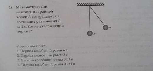 Математический маятник из крайней точки A возвращается в состояние равновесия B за 1 с. Какие утверждения верны?