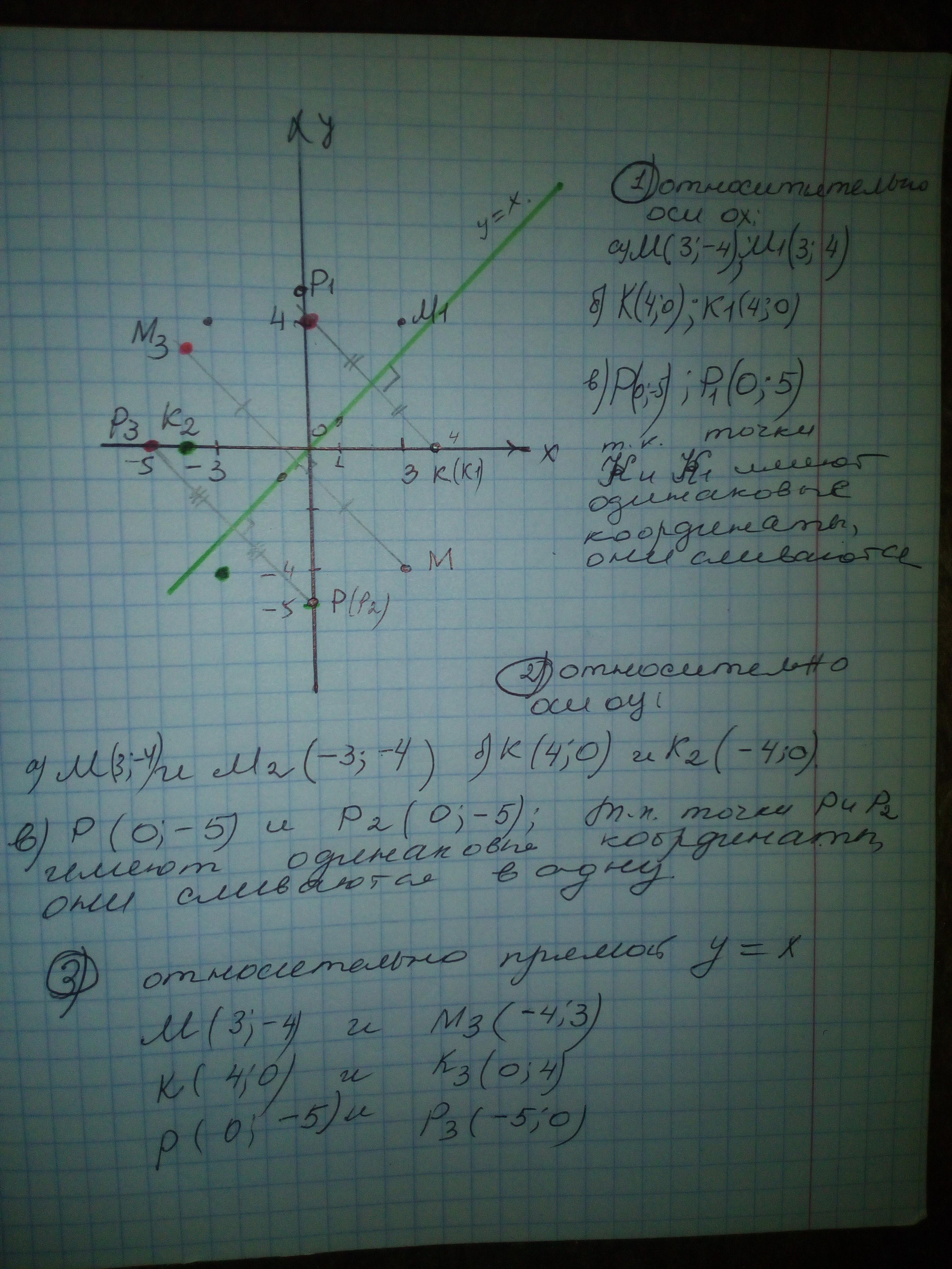 ДАЮ 50 БАЛОВ Побудуйте точки, симетричні точкам М(3;-4), К(4;0), Р(0;-5) відносно: 1) осі ОХ; 2) осі ОУ; 3) прямої, яка містить бісектриси І і ІІІ