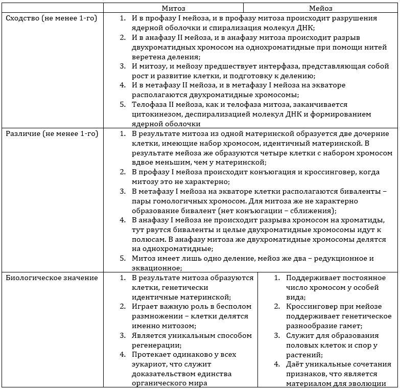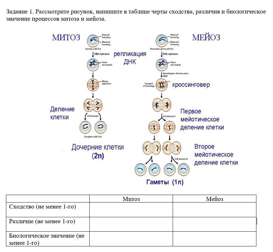 Задание 1. Рассмотрите рисунок, напишите в таблице черты сходства, различия и биологическое значение процессов митоза и мейоза.