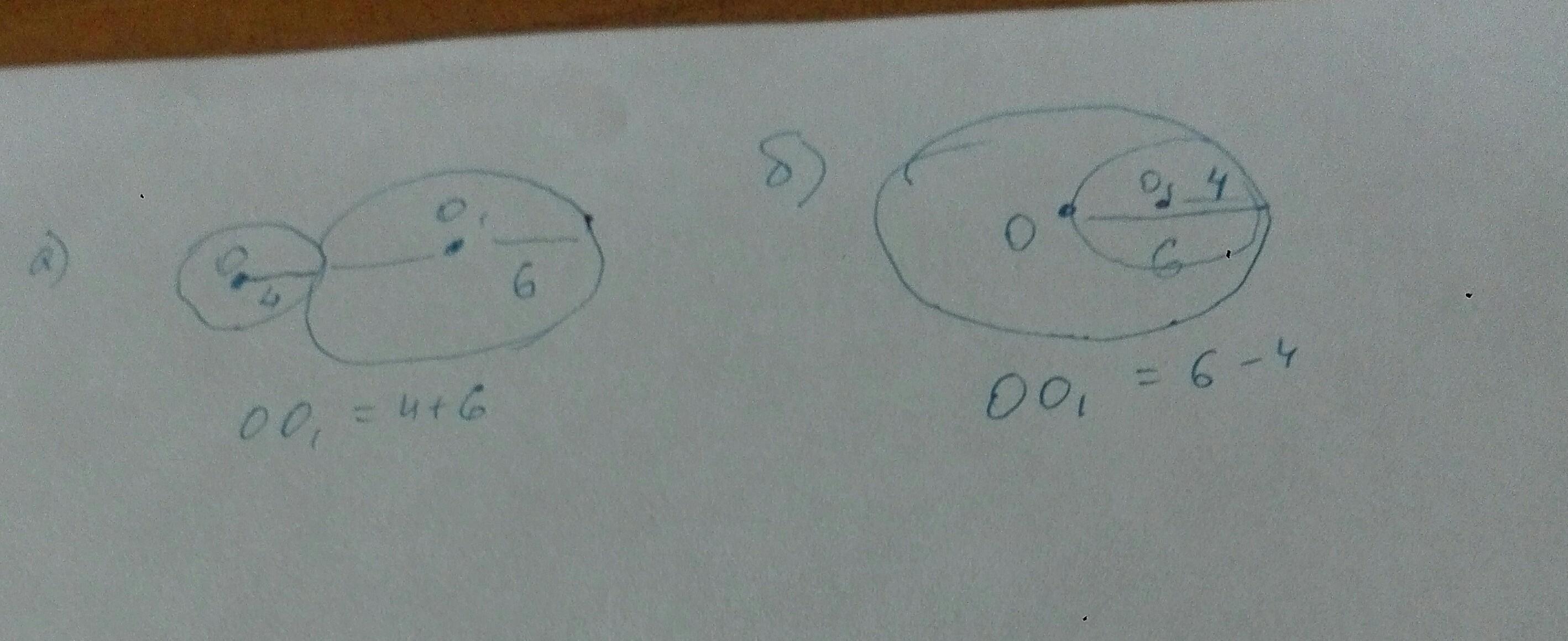 Объяснение: а) очень просто надо просто сложить радиусы обеих окружностей то 6+4=10 б) при внутренних 6-4=2