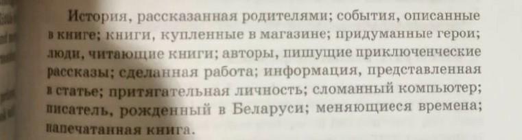 A story told by parents; events described in the book: books bought in a store; fictional characters: people who read books: authors who write adventure stories; completed work; information provided in the article; attractive personality; broken computer; shovel, born in Belarus; changing times; printed book
