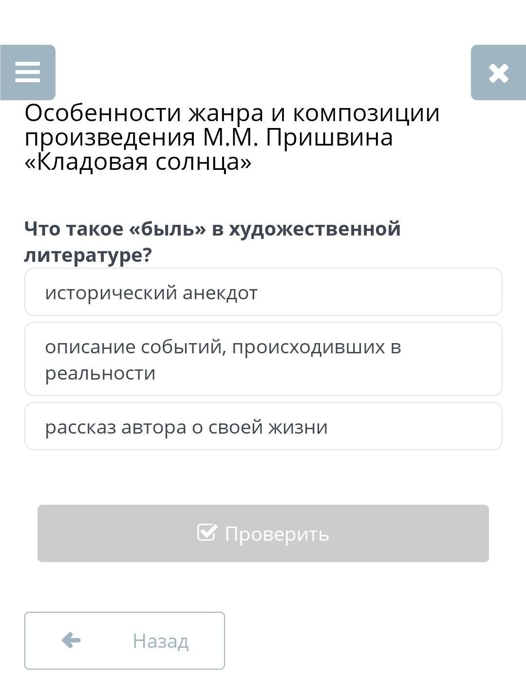Особенности жанра и композиции произведения М.М. Пришвина «Кладовая солнца» Что такое «быль» в художественной литературе? исторический анекдот описание событий, происходивших в реальности рассказ автора о своей жизни