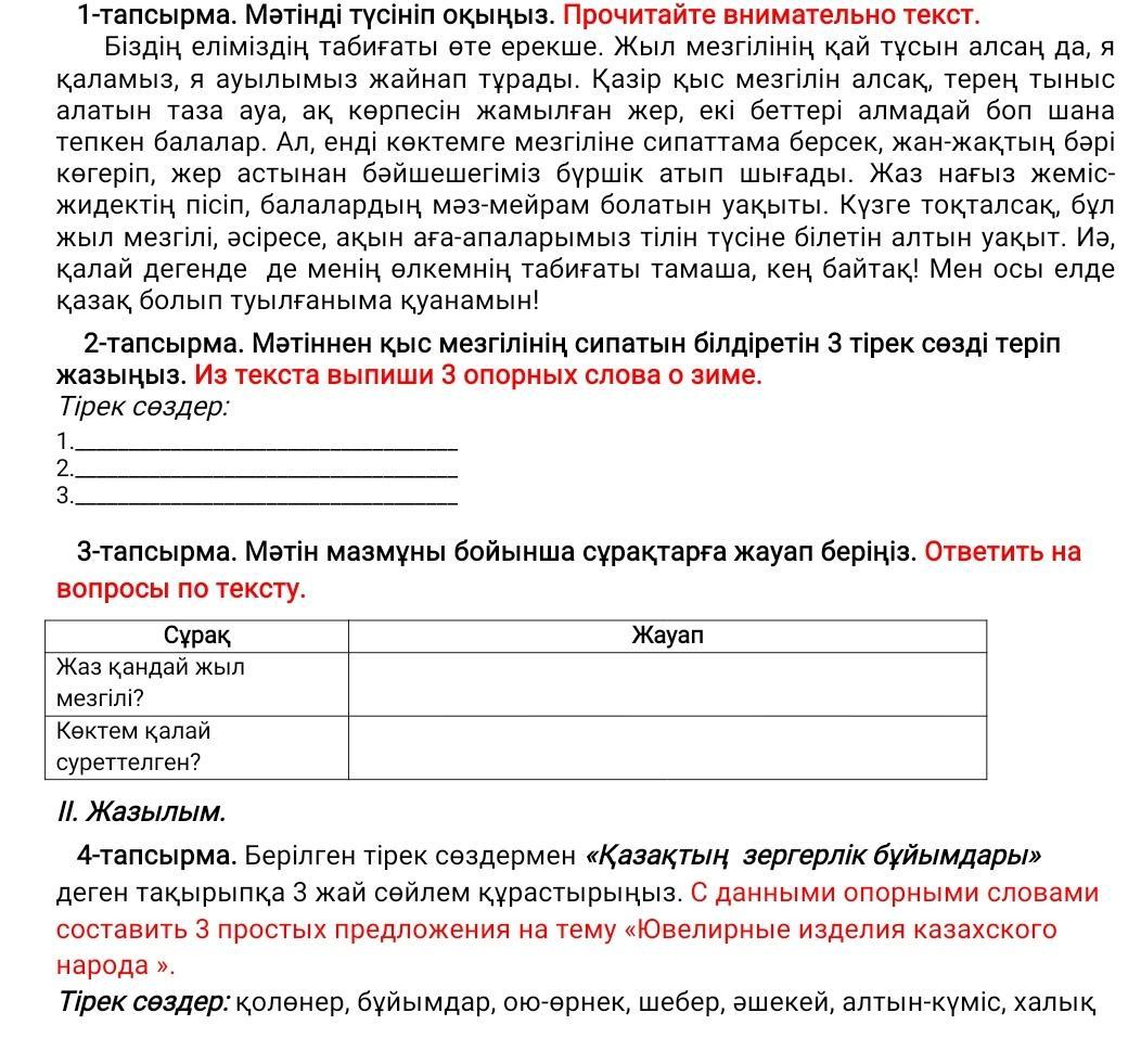 2-ші сұрақтың жауабы: Ал, көктемге тоқталар болсам, жан-жақтың бәрі көгеріп, жер астынан бәйшешек бүршік ататын кезең.