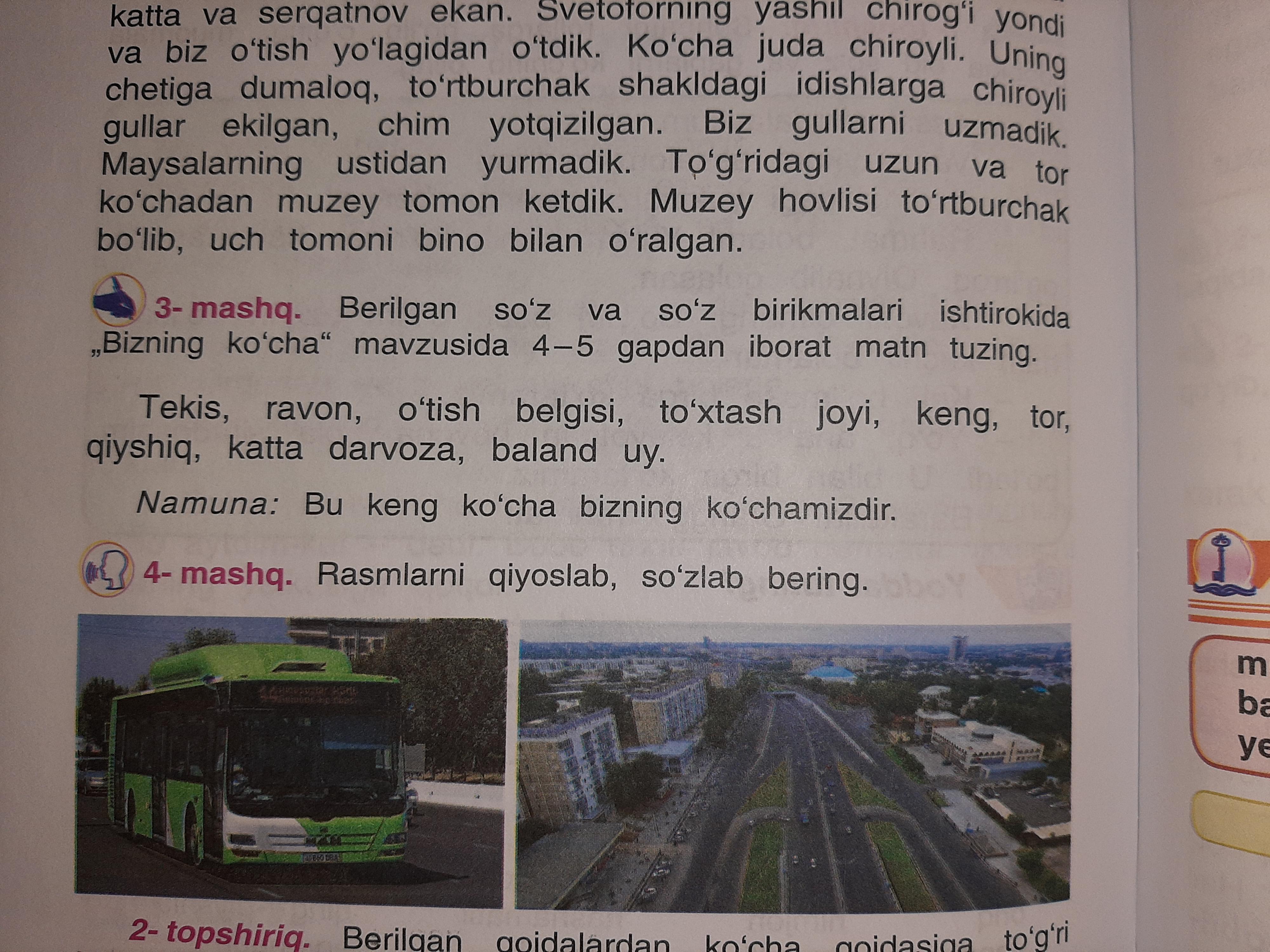 Bizning koʻchamiz tekis, ravon, keng. Koʻchamizda chiroyli baland uylar bor. Baland uylarni katta darvozalari bor. Katta yoʻldan qachon oʻtishimizni bilish uchun oʻtish belgisi bor. Ammo koʻchamizni baʼzigi joylari tor, qiyshiq. Chunki u yerni quruvchilar endi taʼmirlashyapti.