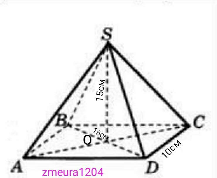 Основою піраміди с ромб, сторона якого дорівнює 10 см, а одна із діагоналей - 16 см.