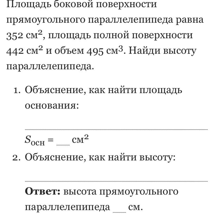 Пошаговое объяснение: полная площадь параллелепипеда состоит из площадей двух оснований плюс площадь боковой поверхности.